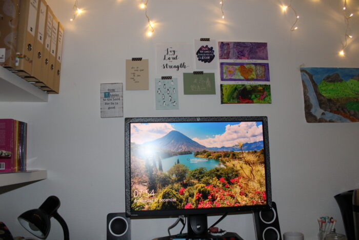 Om 8 uur begon ik met werken. Omdat ik maandag en dinsdag al veel uren had gemaakt, hoefde ik deze dag alleen in de ochtend te werken. Uiteindelijk heb ik ’s avonds nog wel wat gedaan, omdat ik bepaalde sociale media posts niet kon inplannen (de afbeeldingen waren nog niet beschikbaar ;-)). Ik werkte gezellig met de kerstlampjes aan, heerlijk deze tijd van het jaar!