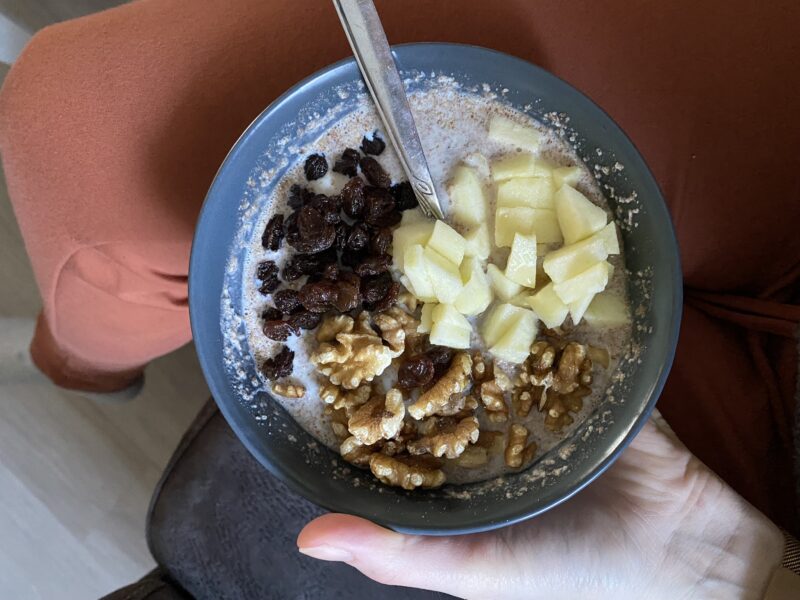 Mijn dag begon redelijk vroeg, ik werd rond zeven uur wakker. Nu gebeurt dat de laatste tijd wel vaker en eigenlijk vind ik dat helemaal prima. Ik ontbeet met teffpap. Deze keer deed ik er een halve appel, wat rozijnen, walnoten en ahornsiroop overheen. Een soort appeltaart om de dag mee te beginnen, maar dan een gezonde versie.