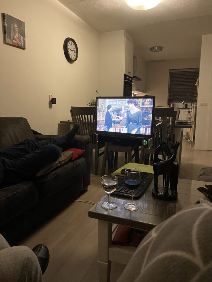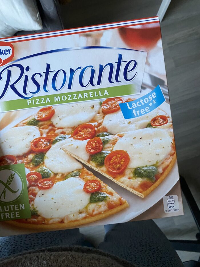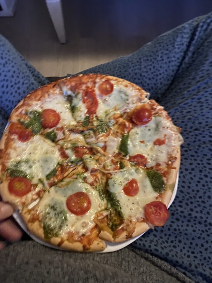 Mijn ouders waren weg die dag en ik had geen zin om uitgebreid te koken, dus ik at deze gluten- en lactosevrije pizza. Ervoor was ik trouwens in de douche geweest, dus ik zit op de foto al in pyjama.