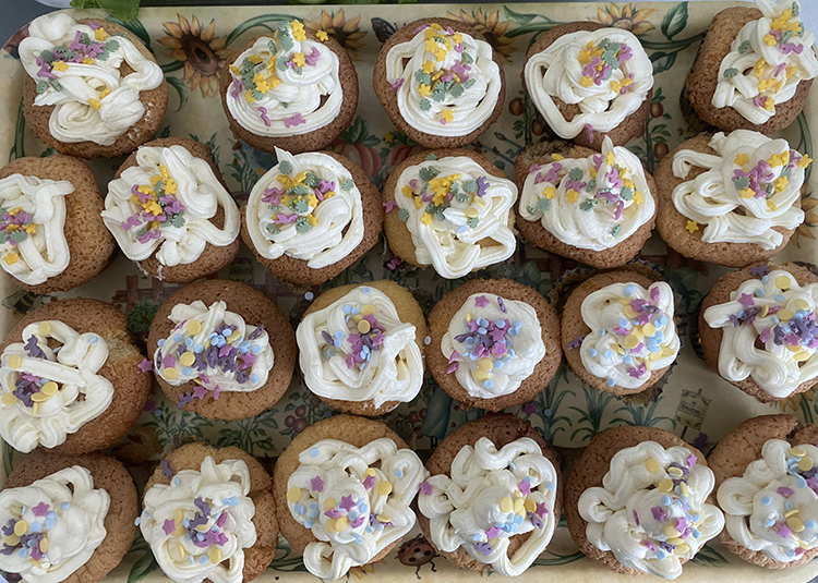 Dat was ook een taak voor mij. Helaas was de spuitzak die ik gebruikte niet zo fijn, maar het is nog aardig goed gelukt, toch? We vonden glutenvrije strooisels bij de HEMA, dus wat maakte het uit dat er eenhoorns en flamingo’s opstonden 😉 Meestal is de hagelslag en dergelijke niet glutenvrij, vandaar.