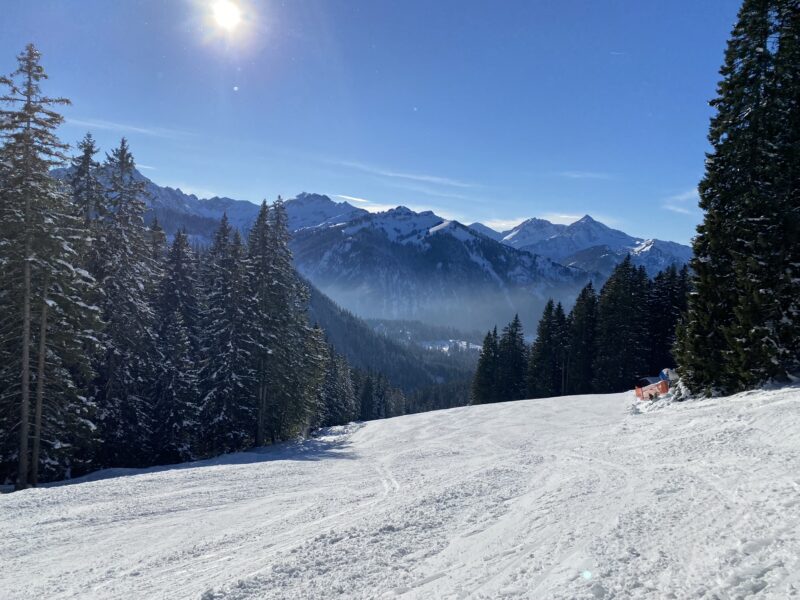 Deze foto heb ik halverwege de afdaling naar beneden gemaakt en hier zie je dus dat je uitkijkt op Oostenrijk. Ongeveer in het midden van de foto zie je trouwens het hoogste punt van de sleeplift. Maar goed, zo prachtig was het! Het was wel goed te merken dat er minder sneeuw lag dan andere jaren, op sommige plekken was de lange afdaling een beetje bruinig – sneeuw gemengd met grond. Normaal gesproken gaan we wat later in het seizoen (in de voorjaarsvakantie), dus dan heb je wat meer kans op sneeuw. Gelukkig had het zaterdag en zondag veel gesneeuwd en was de lange afdaling wel te doen, een week ervoor was daar nog geen sprake van.