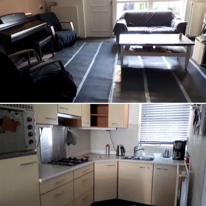 De wekker stond deze dag voor kwart over 7, maar ik was al eerder wakker. Toen ik naar beneden ging zag de woonkamer er opeens heel anders uit. Er lag al wel een paar dagen spul op de vloer ter bescherming van het laminaat, maar nu waren ook alle kussens van de bank weg en lagen er beschermhoezen overheen. 14 juni hebben wij namelijk een nieuwe keuken gekregen en daarvoor moest er nog gestuct worden en natuurlijk moest ook de oude keuken eruit. En dat ging deze dag gebeuren. Ik nam daarom maar een afscheidsfoto van de keuken.