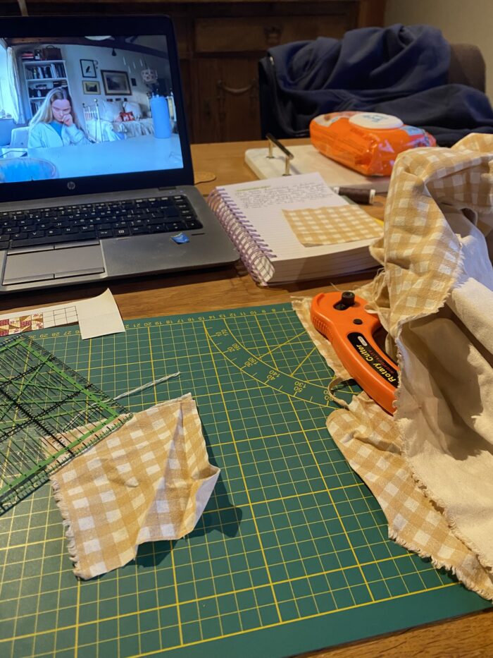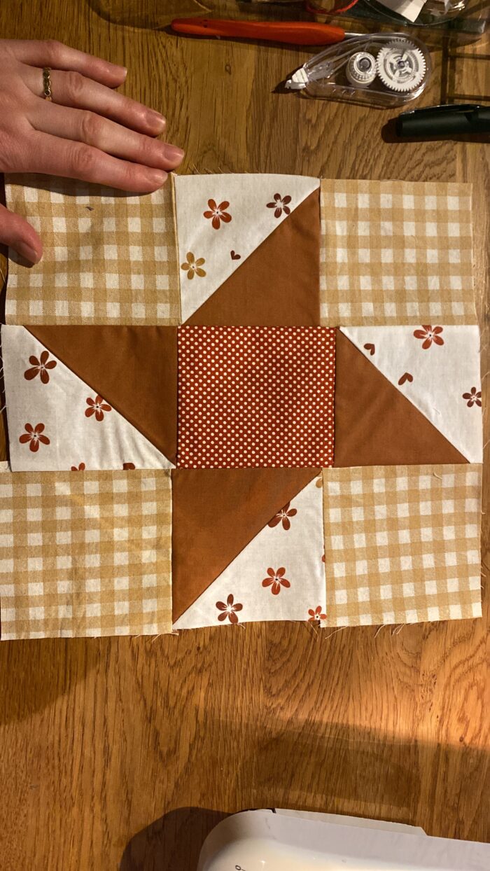 En toen was het tijd om te gaan quilten. Eerst heb ik een zooi vierkantjes gesneden en ben ik het eerste blok in elkaar gaan zetten. Ik had het zorgvuldig getekend, hoe ik het wilde en ik ben heel blij met hoe het geworden is! Het idee is dat ik twee soorten blokken maak, bij de andere variant gaat de stippeltjesstof waar de ruitjesstof zit en vice versa. De andere stofjes blijven wel op dezelfde plek zitten. Ik denk dat het heel erg leuk gaat worden! De blokken in elkaar zetten doe ik trouwens op de naaimachine, maar ik ben wel van plan om de quilt met de hand door te gaan stikken. Maar goed, zo ver is het nog lang niet …