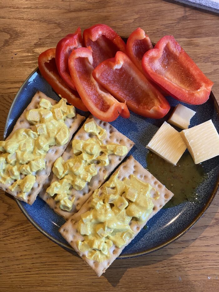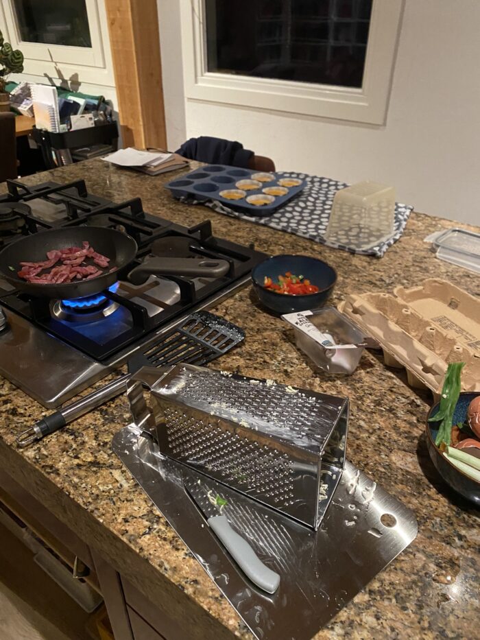 De wekker ging om 5.40 uur en toen ben ik meteen uit bed gegaan, ik was zo enthousiast over mijn knutseldag! Mijn ontbijt was al vrij creatief. Ik maakte ei-muffins met kalkoenspek, paprika, bosui en geraspte kaas. Wist je trouwens dat als je je rasp zo neerlegt, het raspen veel makkelijker gaat? Uiteraard ging er ook ei in, maar dat lijkt me logisch 😉 Verder at ik een kiwi, een paar lychees en twee sneetjes glutenvrij feestbrood. Heerlijk 🙂