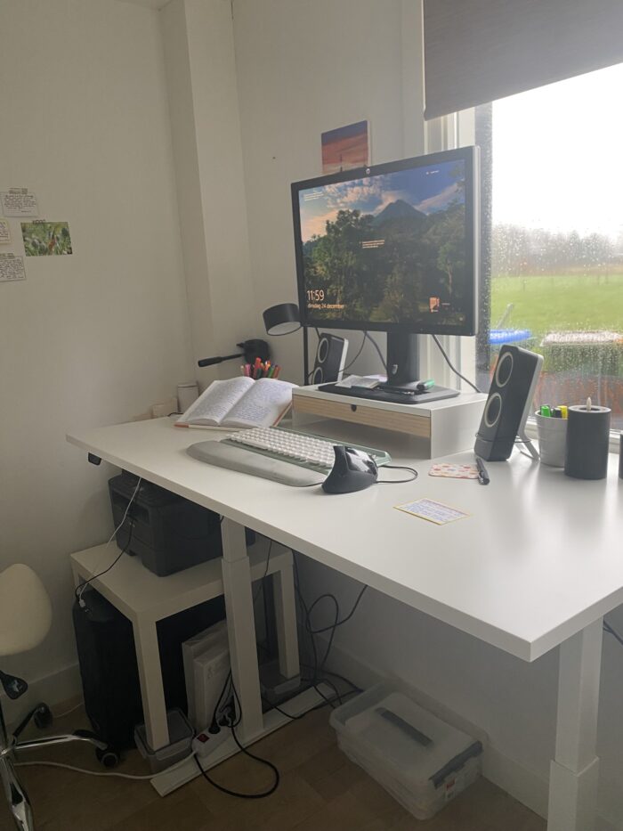 Wat ik af en toe ook deed, was een paar dagen uit mijn dagboek overtypen. Ik had m’n bureau op sta-stand gezet, zodat ik ook zo nu en dan van houding zou veranderen. Verder haakte ik een kerstmuts voor Cupertino, op verzoek van Jaap. Dat had ik een paar weken geleden ook al beloofd, dus dat moest zeker gebeuren. Ik denk dat het haken van de muts en het maken van het pomponnetje me minstens 3 uur heeft gekost, dus toen ik ermee klaar was, was de morgen al bijna voorbij en moest ik accepteren dat niet al mijn woeste plannen uit zouden komen die dag 😉