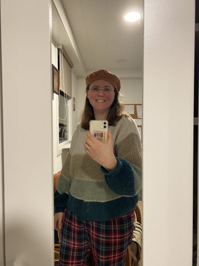 Ik had ook nog een rokje liggen, waar ik nog een elastiek in moest zetten. Vervolgens heb ik ook nog een bijpassend baretje gemaakt (voor in de kerk). En ja, het grootste gedeelte van de dag liep ik er zo bij, in ieder geval nadat ik in de douche was geweest. Een kerstige pyamabroek en een oversized trui 🙂