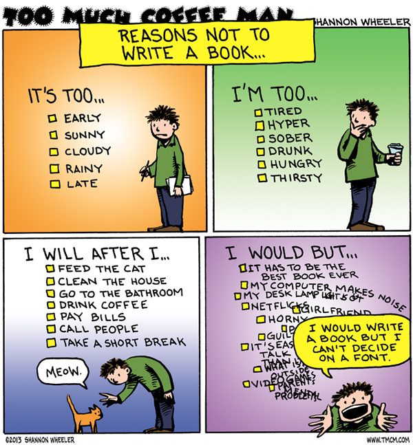 Omdat ik via Facebook en andere social media verschillende sites over schrijven volg, kom ik ook vaak grappige plaatjes tegen. Deze zijn als schrijver vaak herkenbaar, maar ook voor andere mensen. Wat veelgehoord is dat een ‘writer’s block’ een van de grootste vijanden is van een schrijver. Dat klopt wel. Het plaatje wat ik vandaag ga laten zien gaat ook een beetje over zo’n writer’s block. Het zijn namelijk vier plaatjes met elk meer dan genoeg excuses om niet te beginnen met schrijven. Ik vond de afbeelding al jaren geleden, sloeg het op op mijn computer en weet daarom dus niet meer waar het vandaan komt. Maar leuk is het wel, kijk maar mee.