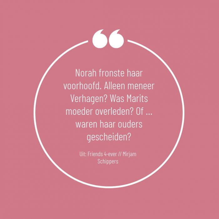 Onder het kopje mutaties zag ze opeens een bekende naam. Nieuw ingekomen, meneer Verhagen en zijn twee kinderen, Marit en Samuël. Norah fronste haar voorhoofd. Alleen meneer Verhagen? Was Marits moeder overleden? Of … waren haar ouders gescheiden? Wat gek … ze was al ruim twee maanden bevriend met Marit, maar hier had ze geen idee van!