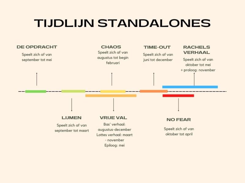 Time-out speelt zich af van juni (uitslag examens) tot december (Lynns terugkeer uit Engeland). Het heeft overlap met No fear, waar je pas in het vierde of vijfde hoofdstuk leest over Lynns terugkeer. Het verhaal van Roos begint in september/oktober en loopt door tot april van het jaar erna. Ook Rachels verhaal heeft overlap met dit verhaal. Het begint op 7 oktober (de verjaardag van Lynn) en loopt door tot april van het jaar erna, net als No fear dus. Maar … het bevat ook nog een epiloog en die speelt zich af in november erna.