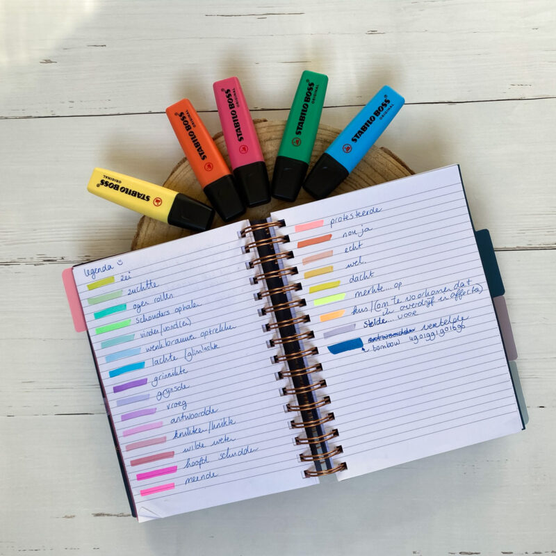 De woorden waarvan ik weet dat ze veel voorkomen in mijn manuscripten schrijf ik op een briefje, elk achter een kleur van een (markeer)stift. Tegenwoordig gebruik ik daar stabilomarkers voor, die heb ik in genoeg verschillende kleuren. Tijdens het doorlezen markeer ik het woord als ik het tegen kom en zo kan ik in één oogopslag zien hoe vaak een woord wordt gebruikt op een bladzijde. Een zin die met ‘maar’ begint’ omcirkel ik meestal met een pen, evenals zinnen die met ‘ze’ beginnen.