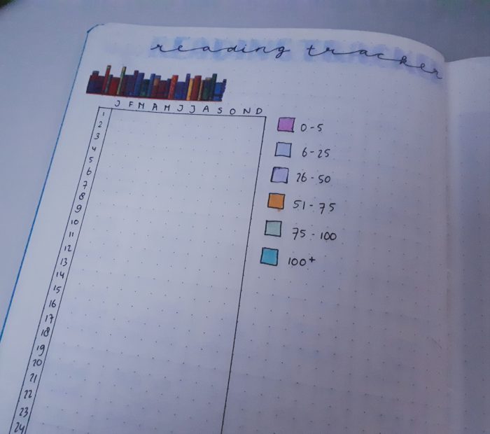 Zoals je kunt zien op de foto is het een overzicht van het jaar en voor elke dag is er een vakje. Op een dag dat ik minder dan 5 bladzijden lees, kleur ik het vakje roze in, op een dag dat ik er 6-25 lees kleur ik het vakje dat bij die dag hoort paars en zo voorts. Het is heel erg simpel, maar erg leuk om bij te houden.