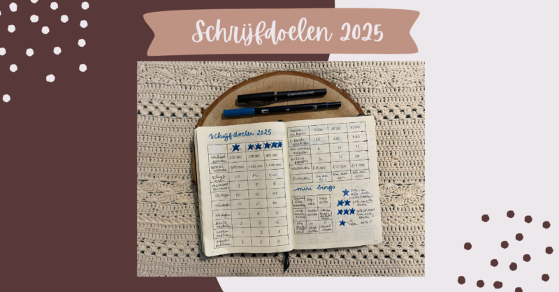 - Korte verhalen: 3/6/12 – De korte verhalen heb ik een beetje opgegeven, haha. Afgelopen jaar schreef ik maar één kort verhaal (met de hand) en telde ik de novelles die ikzelf uitgaf ook maar als kort verhaal. Dat wil ik in 2025 toch anders doen, maar dat betekent wel dat ik een lager aantal als doel stel.