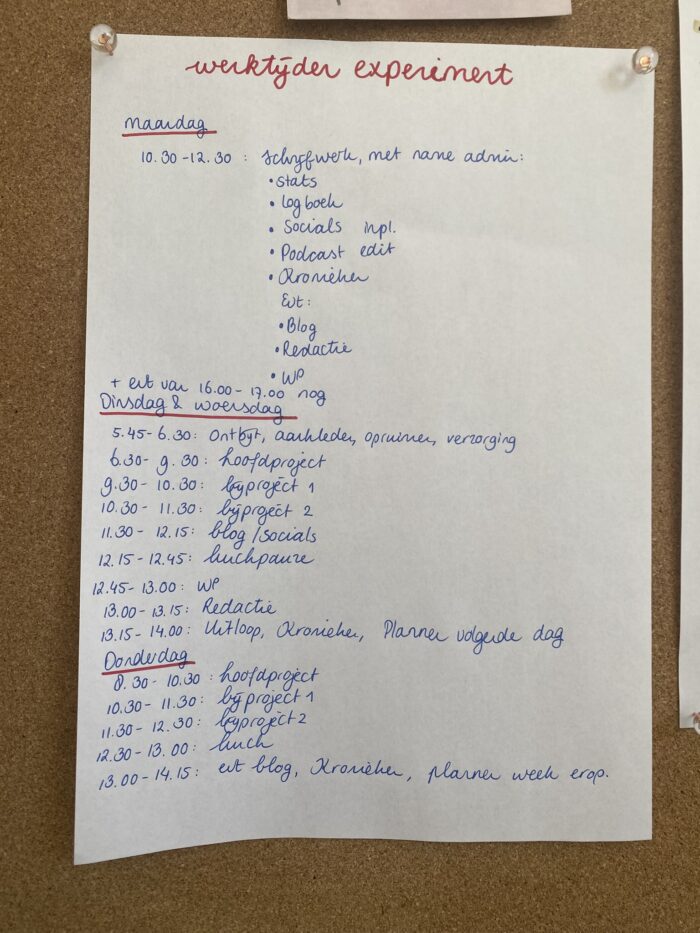 Het valt me wel op dat je niet veel pauze hebt, maar een half uur. Is er een reden dat je geen koffiepauze neemt? Ik zou zelf denk ik eerder een uur lunchpauze nemen maar dat is dan inclusief alles opruimen en eventueel een korte wandeling.