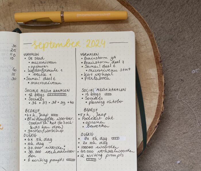 Ik heb eens teruggekeken, maar voorgaande jaren heb ik eigenlijk nooit veel geschreven in september. In 2022 en 2023 was ik deels op vakantie (en in 2022 werd ik na die vakantie ook nog ziek), in 2021 was ik te druk met daten met Jaap, en in 2020 en 2019 werkte ik bij het LCJ en was september altijd een drukke maand. En in 2018, toen ik ook zo goed als fulltime schreef, ging ik volgens mij ook op vakantie in september. De vakantie staat nu iets later gepland, 1 oktober gaan we weg. En ik geloof dat ik extra ga genieten van die vakantie als ik deze maand flink heb kunnen schrijven en misschien wel een nieuw record heb kunnen vestigen, in ieder geval voor september 😉