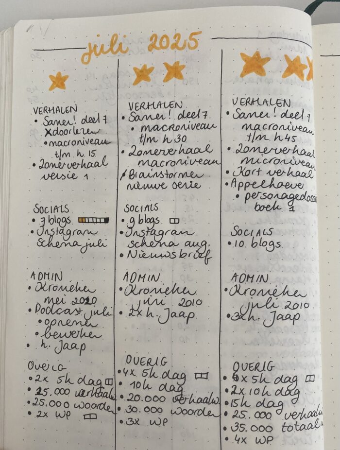 Ik heb de planning voor juli geprobeerd mild te houden, maar ik wilde wel weer iets doen. Het was eigenlijk de bedoeling dat ik afgelopen maand (eind juni) al mijn zomerverhaal zou publiceren, maar helaas wordt dat toch augustus. Waarover het gaat, blijft nog even geheim 😉 Verder werk ik hard aan Samen! deel 7 (die inmiddels een andere titel heeft dan Help! Dit is het laatste deel), zodat het gewoon in april 2026 kan verschijnen. Ik loop zelfs iets voor op m’n planning, wat alleen maar mooi is!