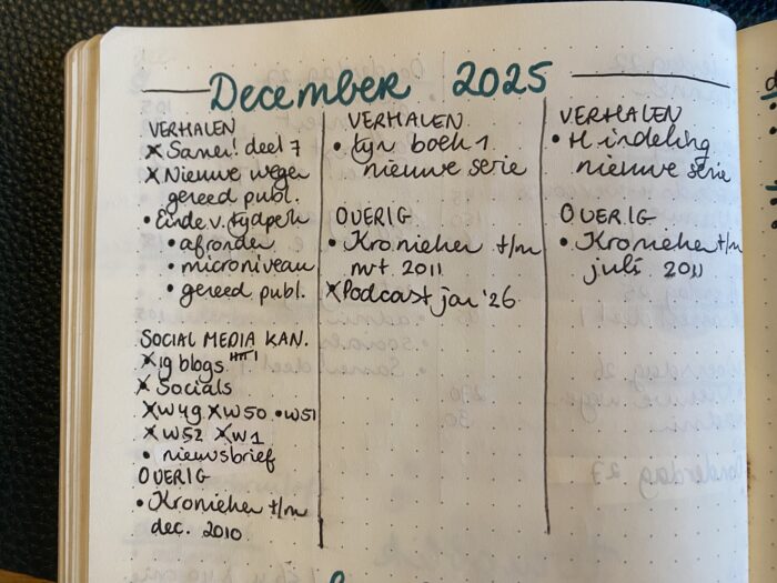 Hè, wat fijn om toch nog heel eventjes 2025 te mogen schrijven. Ik vond het namelijk een heel mooi getal, 2026 is toch wat ingewikkelder. Maar in dit blogbericht blik ik terug op de laatste schrijfmaand van het jaar, heb ik alles af kunnen ronden wat ik af wilde ronden? En hoe zit het met de eerste maand(en) van 2026, ga ik dan schrijven? Je leest het hier!