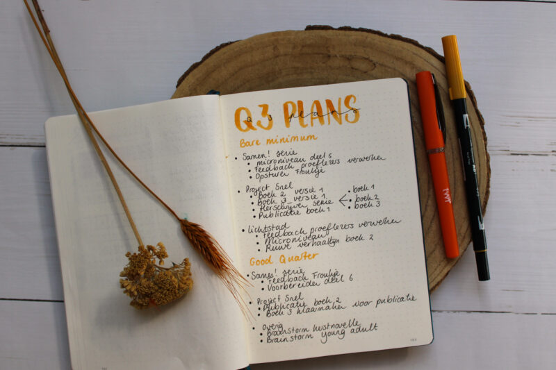 Ik vond het heel erg lastig om (haalbare) doelen op te stellen voor het derde kwartaal. Enerzijds ben ik bang dat ik te veel van mezelf vraag – persoonlijk gaan er ook weer dingen gebeuren (deel ik vanzelf meer over), maar ik wil aan de andere kant niet dat het mijn schrijfwerk en productiviteit in de weg staat. Uiteindelijk heb ik ervoor gekozen om me op drie projecten te richten: