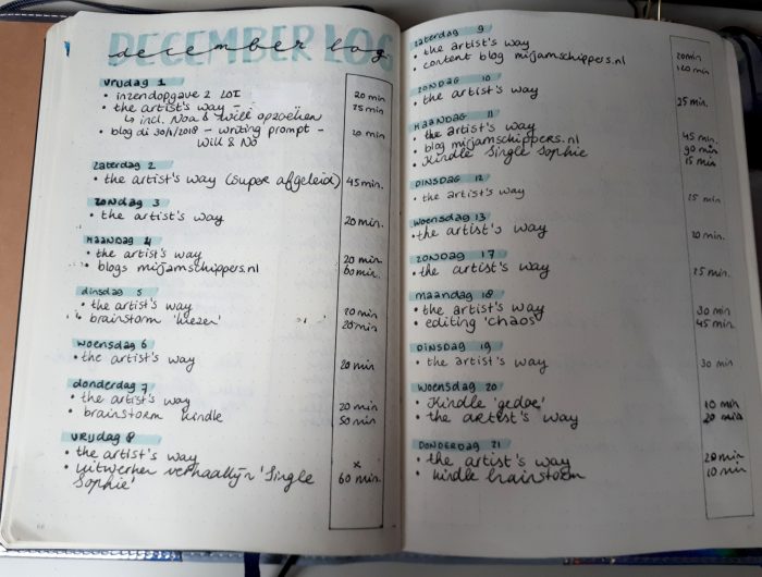 Zoals ik vorige week al een beetje beloofd hebt, komt er vandaag een bericht online waarin ik je het een en ander vertel over mijn schrijven van de afgelopen maand. In december 2017 heb ik voor het eerst een logboek bijgehouden, waarin ik opschreef hoeveel minuten ik ongeveer per dag schreef. Kijk en lees met me mee!