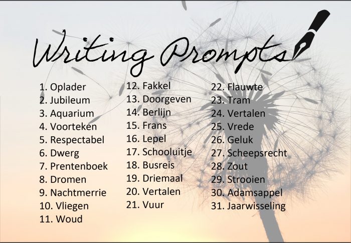 Volgens mij zijn het weer allemaal nieuwe woorden, maar heel misschien zit er wel een dubbele tussen. Vorige maand zei ik al dat dit geen enkel probleem hoeft te zijn. Wil je nog eens lezen wat je allemaal kunt doen met deze writing prompts? Lees dan dit bericht!