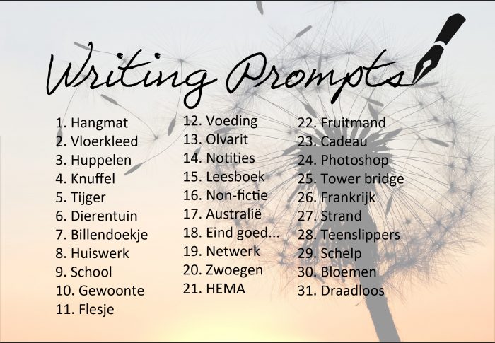 Ook voor deze maand heb ik weer 31 nieuwe woorden gekozen waarover je kunt schrijven. Elke manier is mogelijk. Meer weten over writing prompts? Lees dan dit bericht!